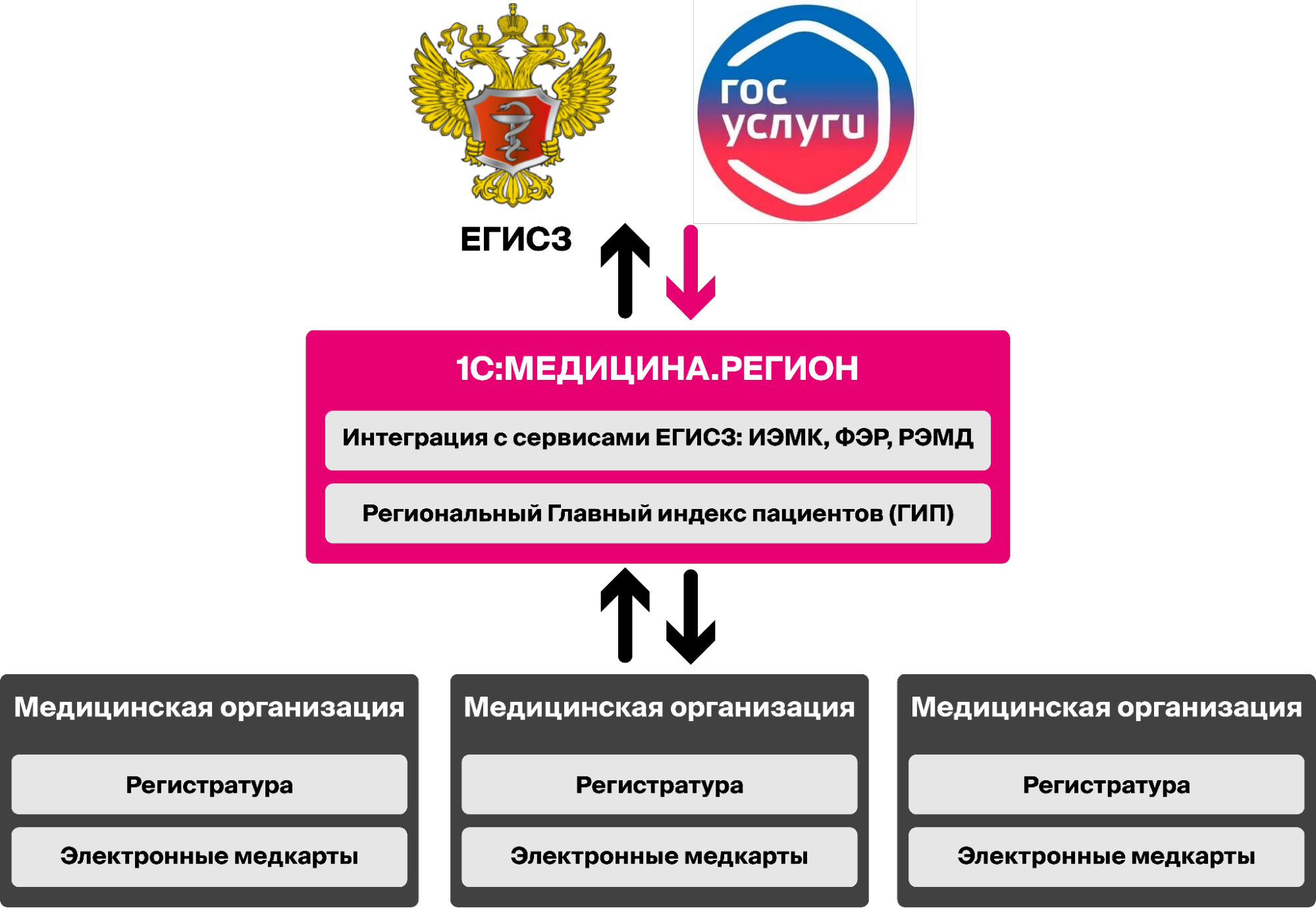 Продукт 1С:Медицина.Регион разработан для создания государственных информационных систем (ГИС) в регионах Российской Федерации в системе здравоохранения с подключением РЭМД, ФЭР, ИЭМК, ЕГИСЗ. Также решение может быть использовано для подключения к единой государственной информационной системе в сфере здравоохранения.