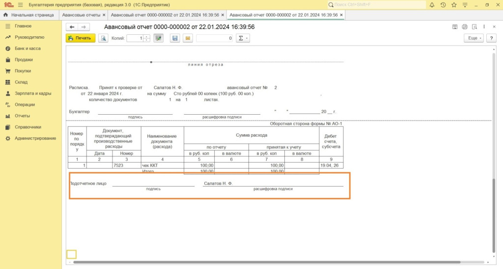 Как распечатать авансовый отчет в 1С Бухгалтерии 8.3