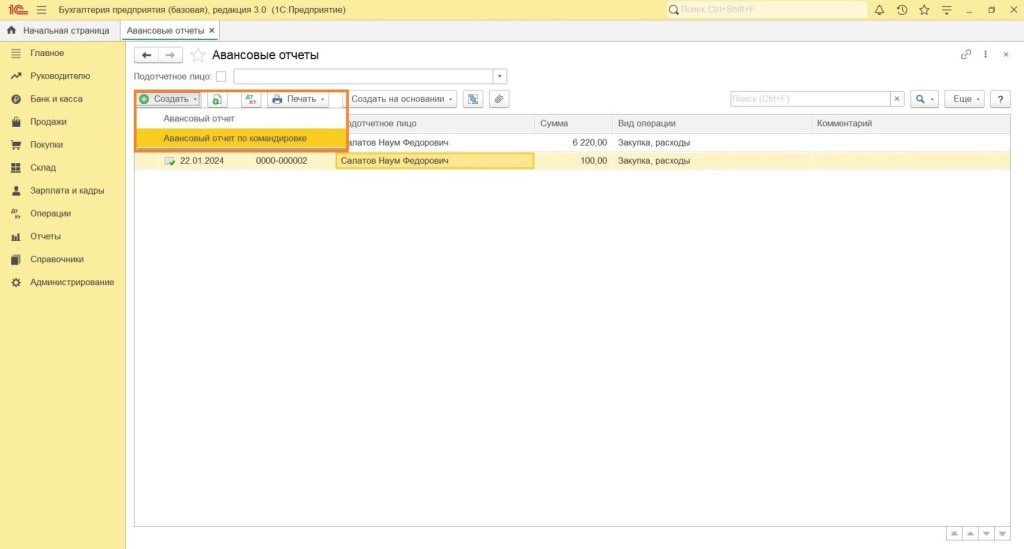 Приступаем к созданию авансового отчета в 1С Бухгалтерия.