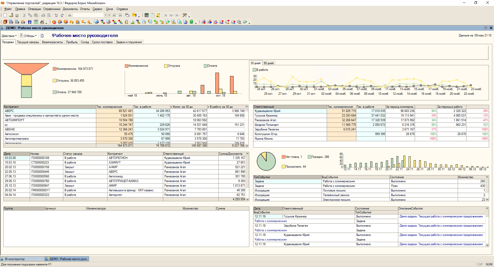 На дашборд «Рабочее место руководителя» выведены все ключевые показатели продаж, которые интересны руководителю. Здесь сразу видно KPI менеджера и насколько он соответствует поставленным целям по конкретному клиенту.