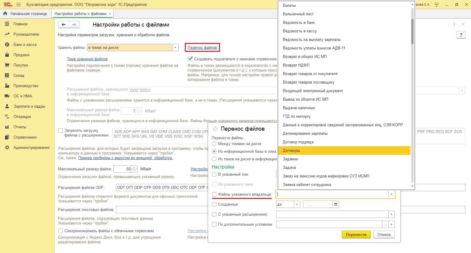 Доступны дополнительные настройки переноса, так, можно отметить файлы указанного владельца и загрузить только договоры, как указано на рисунке.