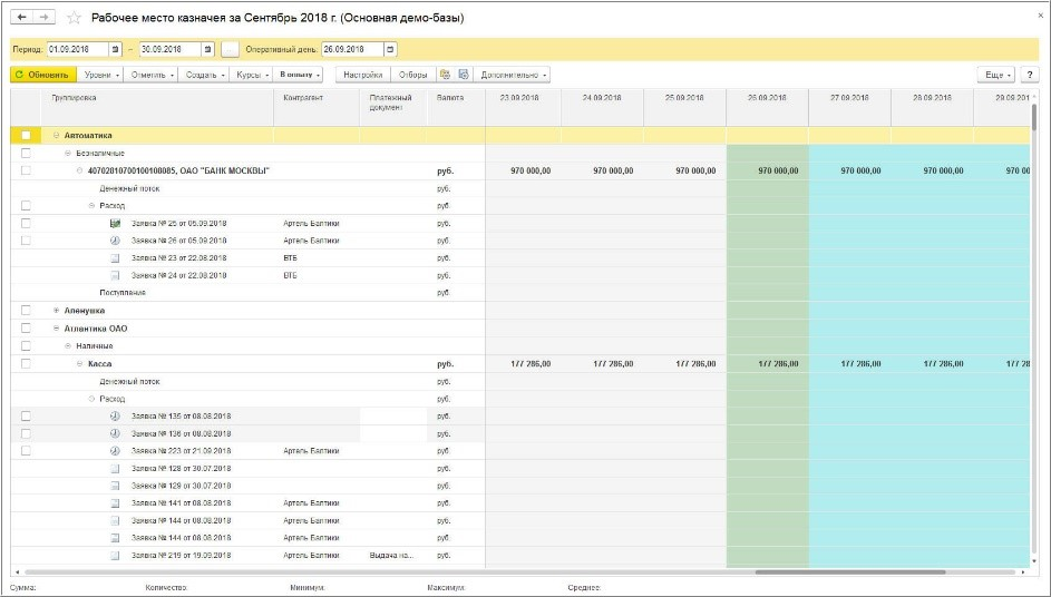 Отдельно стоит отметить логику отображения плановых данных. Если заявка или планируемое поступление были полностью исполнены в текущем дне, они исключаются из календаря. Если исполнение частичное, в отчете отображается остаток обязательства. Аналогично работает механизм по прогнозам платежей: если на основании прогноза создана заявка, прогноз не дублируется, а в календаре показывается только неиспользованный остаток. Это исключает двойной учет и обеспечивает корректную картину будущих денежных потоков.