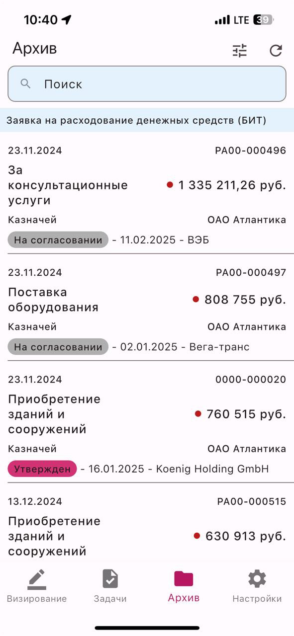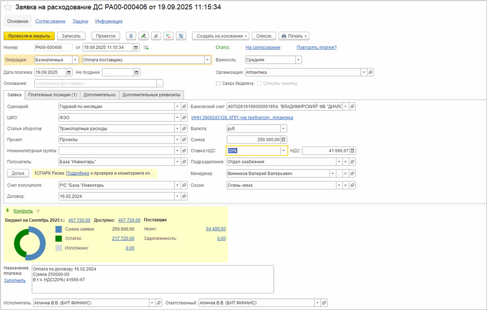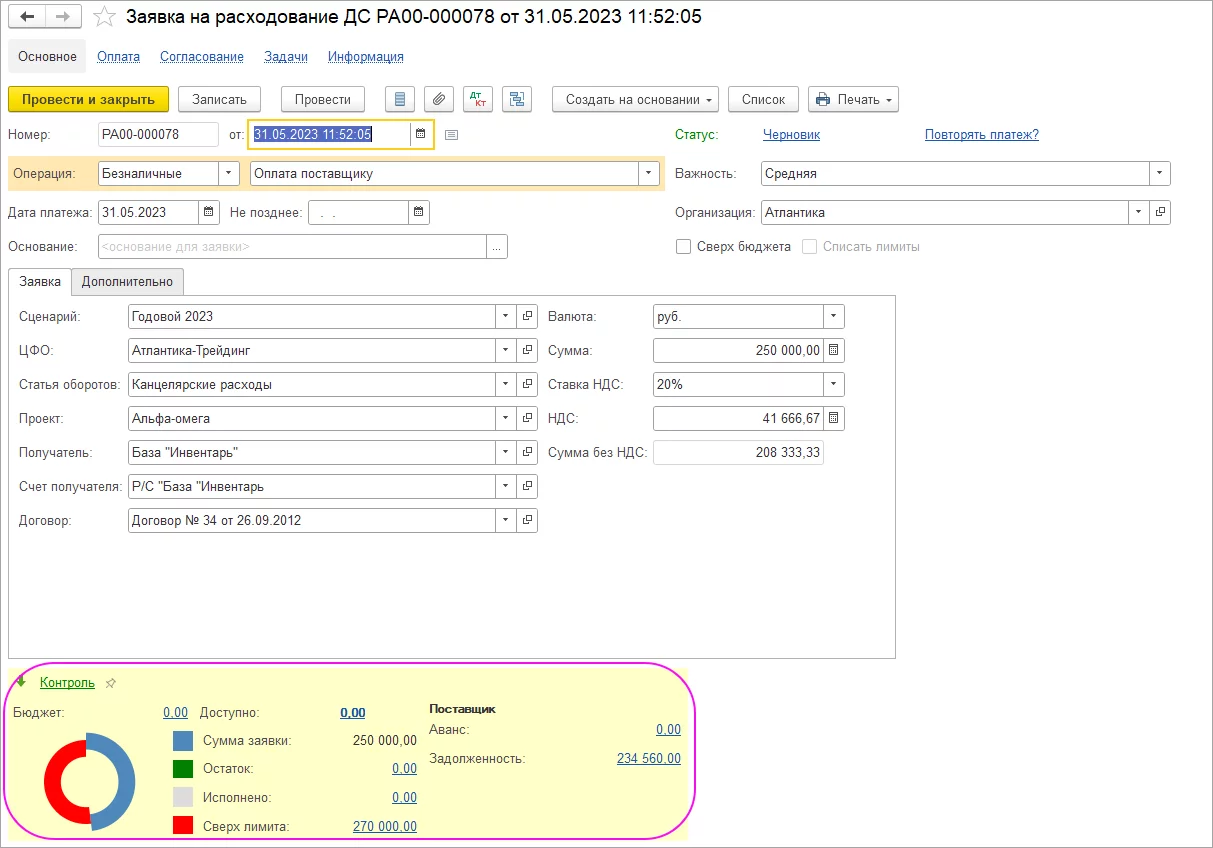 В заявке фиксируются ключевые параметры платежа: сумма, дата, форма оплаты, статья ДДС, ЦФО и назначение платежа. После согласования на основании утвержденных заявок автоматически формируются платежные документы. В системе реализован контроль вложений (например, сканов счетов) и статусов заявок. При отмене или корректировке заявок система возвращает лимиты, сохраняя корректность плановых и бюджетных показателей.