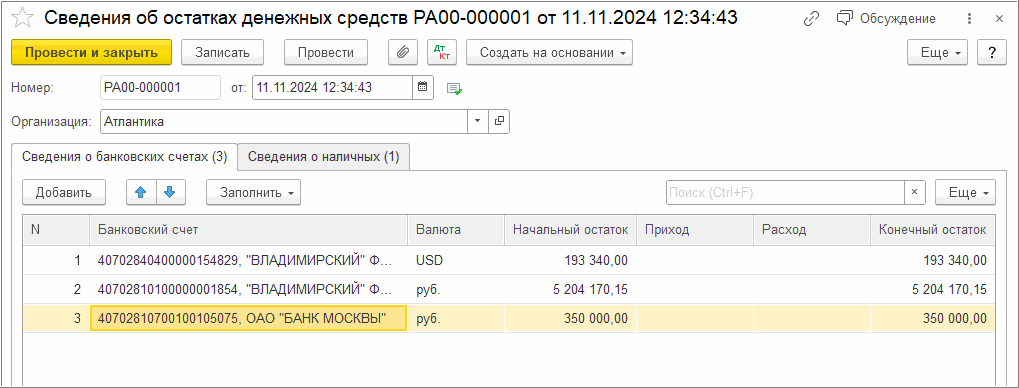 Документ «Сведения об остатках денежных средств» используется для ручного ввода начальных и конечных остатков денежных средств, а также оборотов (приход и расход). Данные вводятся в разрезе конкретных банковских счетов и касс, с указанием валюты, начального остатка, оборотов за период и конечного остатка. Таким образом формируется управленческая картина движения денежных средств, актуальная на текущий момент времени.