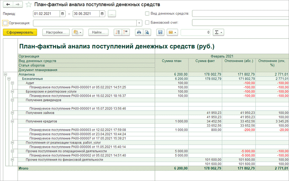 Отчет «План-фактный анализ поступлений денежных средств»