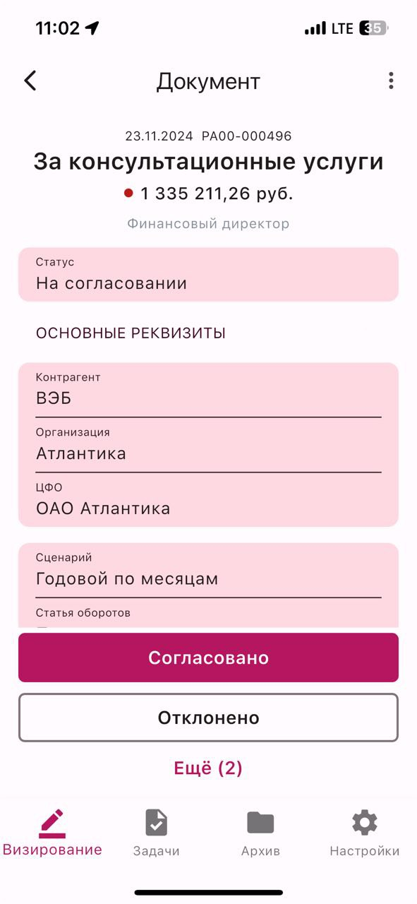 Результатом анализа становится структурированная сводка для согласующего лица. Руководитель получает не «сырую» заявку, а готовый вывод по платежу, что позволяет принимать решения быстрее и более осознанно, особенно при большом объеме операций.