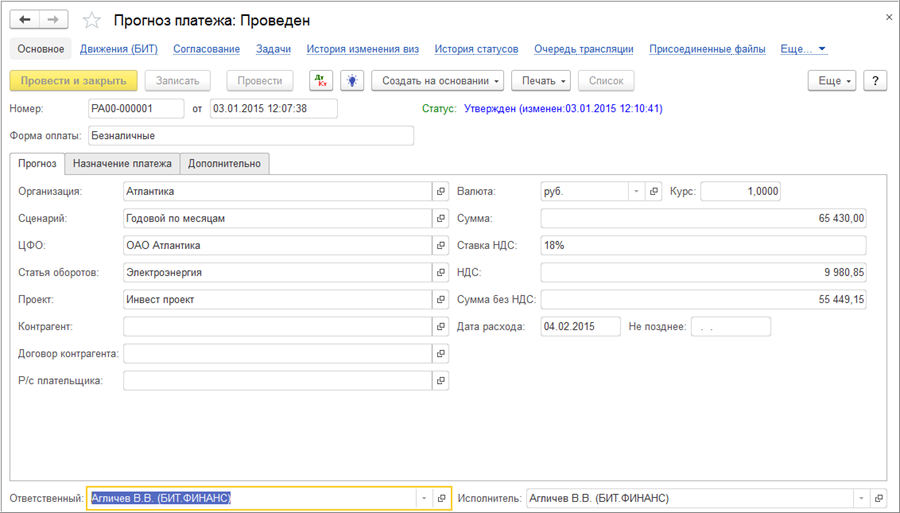 Прогноз платежа ведется в разрезе ключевых управленческих аналитик: сценария бюджетирования, ЦФО, статьи оборотов, проекта, контрагента, договора, валюты и даты расхода. В системе предусмотрены механизмы контроля — можно ограничить превышение суммы заявок над прогнозом, а также контролировать допустимое отклонение дат платежей от запланированных. Таким образом, прогноз становится не просто ориентиром, а управляемым финансовым обязательством.