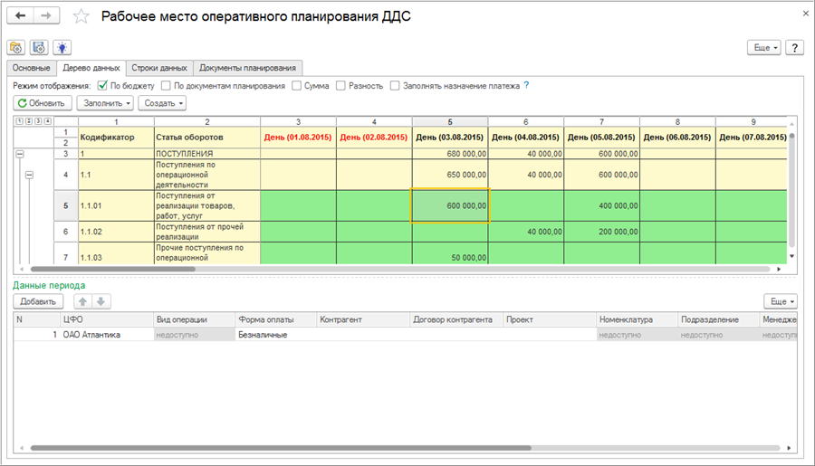 Финансовая служба может видеть отклонения между бюджетом и оперативными документами, распределять суммы по периодам (день, неделя и т.д.), управлять сценариями и контролировать заполнение обязательных аналитик. Такой подход обеспечивает сквозную управляемость: от утвержденного бюджета к конкретным платежам и поступлениям.