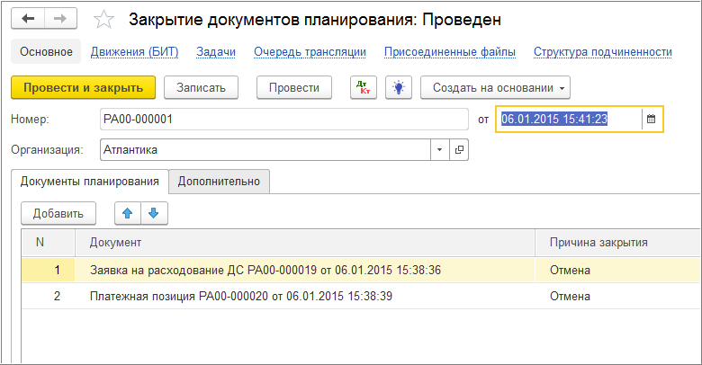 Документ «Закрытие документов планирования»
