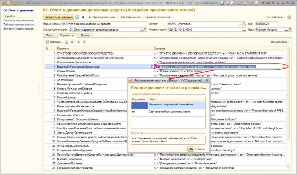 Параметры будут отражены в макете ОДДС в виде квадратных скобок, например, [ВыручкаОтПокупателейЗаказчиков]. Для формирования отчета язык выбирается в параметре «Язык»: