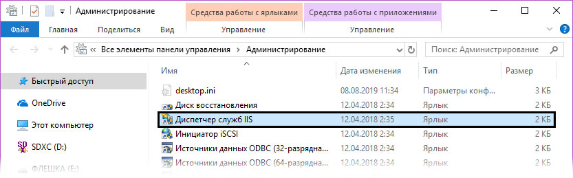 Во вкладке «Администрирование» запускаем «Диспетчер служб IIS».