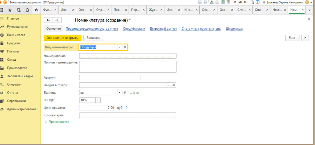 Для того чтобы начать учет производства, необходимо определить номенклатуру выпускаемой продукции. Для выполнения этих действий в в системе 1С потребуется перейти в меню «Справочники», затем  в раздел «Товары и услуги», где надо нажать на указатель «Номенклатура». Нажатие  кнопки «Создать» вызовет всплывающее окно с надписью «Номенклатура (создание)». Здесь заполняются поля,в которые вносятся данные о наименовании  продукции (краткое и полное название), единицы измерения и артикул. При дальнейших расчетах эти записи значительно упростят процедуру учета продукции. В используемом примере товаром будет выступать изготовленная из натуральной кожи черного цвета сумка.