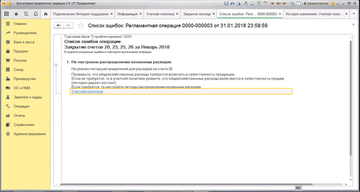 Если метод учета затрат неполно или неправильно отражен, системой 1С будет выдана информация, в которой будут указана конктеная ошибка, допущена в учетной политике, и выданы предложения по действиям, которые  смогут устранить допущенную неточность.