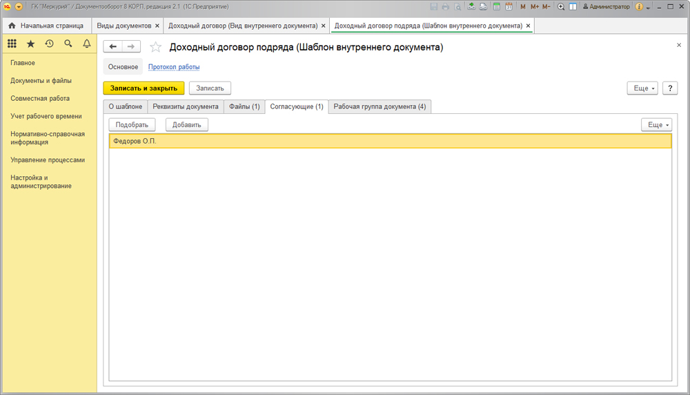 - если указать в шаблоне список лиц, согласующих данный документ, а также перечень лиц, входящих в рабочую группу по данному договору, то это исключит ошибки компетенции (когда договор попадает на подписание непрофильному ответственному специалисту).