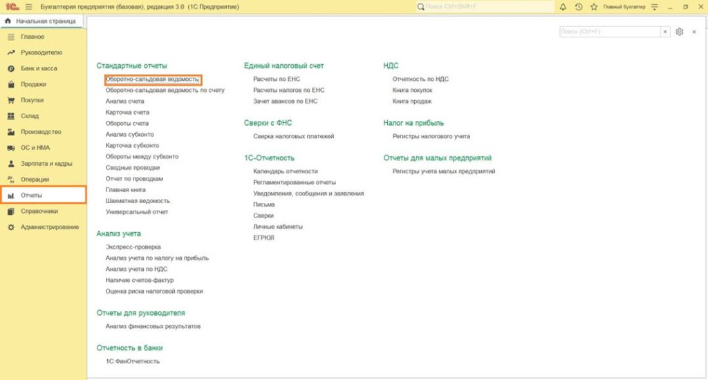 Далее проверяем отсутствие конечного сальдо по 26,90,91 и другим счетам, сформировав бухгалтерскую отчетность, например, оборотно-сальдовую ведомость: Отчеты => группа Стандартные отчеты => Оборотно-сальдовая ведомость.