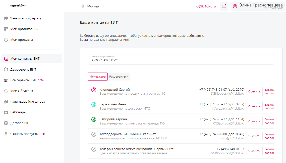 В разделе можно найти контакты менеджеров, которые работают с вашей организацией по разным направлениям (например, ИТС или аренде ПО).